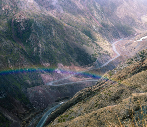 Ein Regenbogen hebt sich vor den steilen und kargen Hängen des Töö-Aschuu-Passes in Kirgistan ab. Dieser 120 Kilometer von Bischkek gelegene Berg gipfelt auf 3500 Metern Höhe und stellt… [...]
