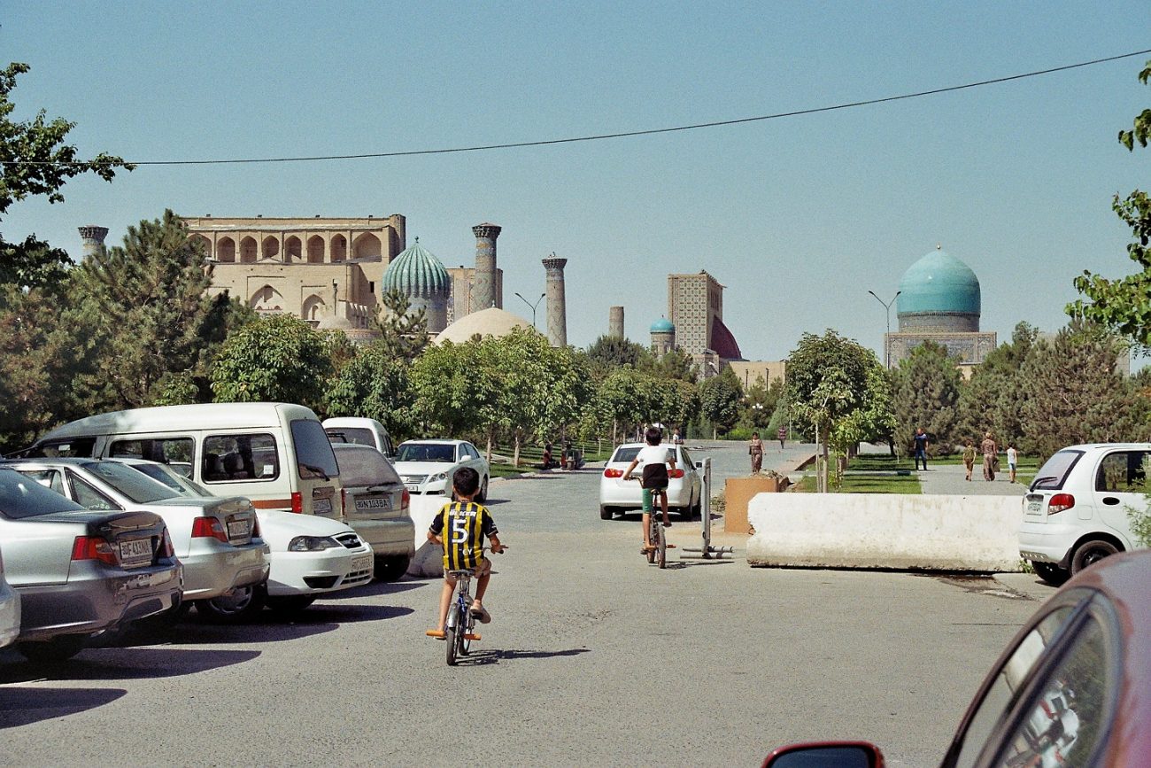 Zwei Jungs fahren mit ihren Fahrrädern in der Nähe des Registan-Platzes in Samarkand.