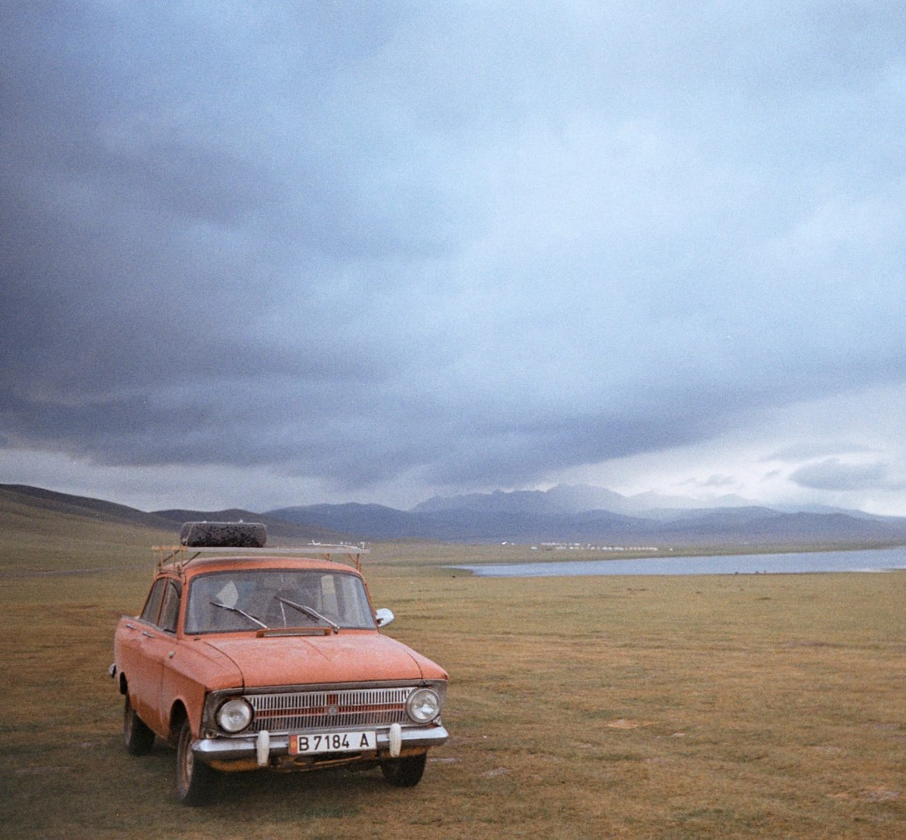 Ein sowjetisches Auto, geparkt am Ufer des Songköl-Sees in Kirgistan.