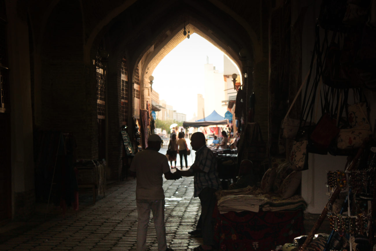Zwei Männer grüßen einander auf einem der überdachten Märkte in Buchara (Usbekistan).