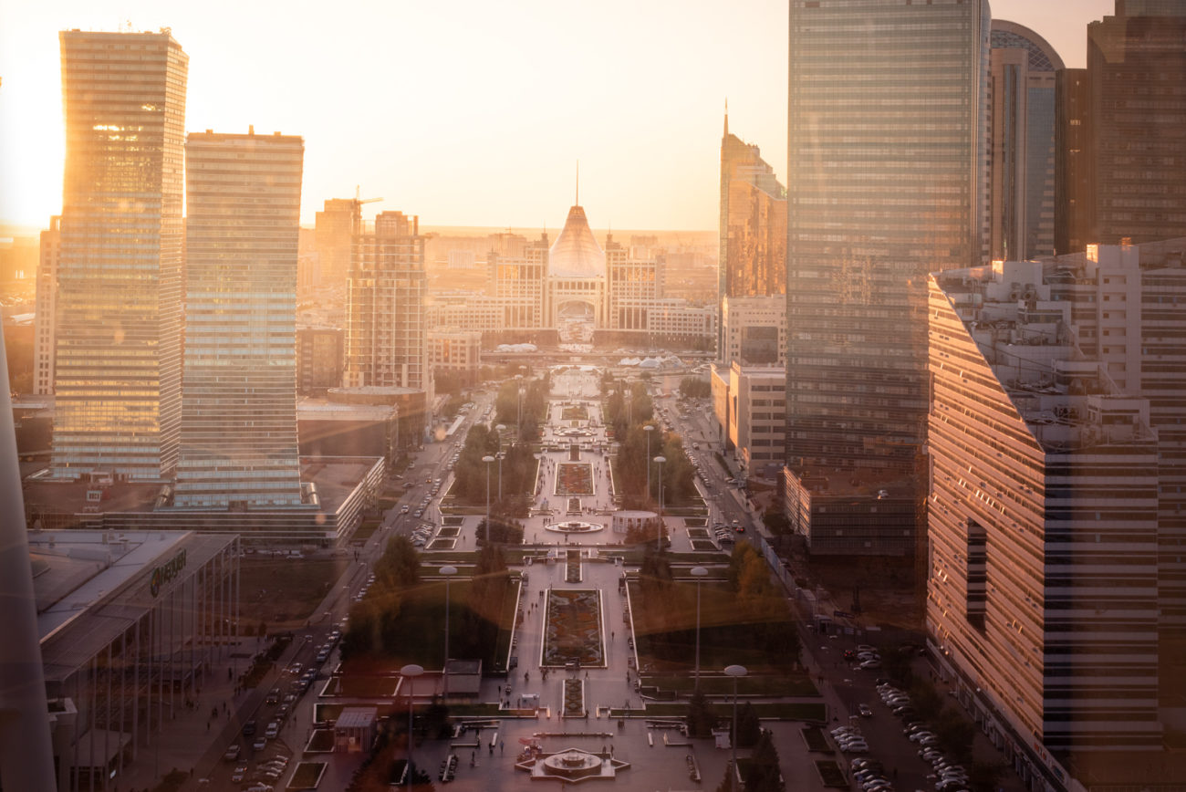 Der Bayterek Tower bietet einen atemberaubenden Blick auf den Nurzhol Boulevard, eine der großen Fußgängerachsen in der kasachischen Hauptstadt Nur-Sultan.