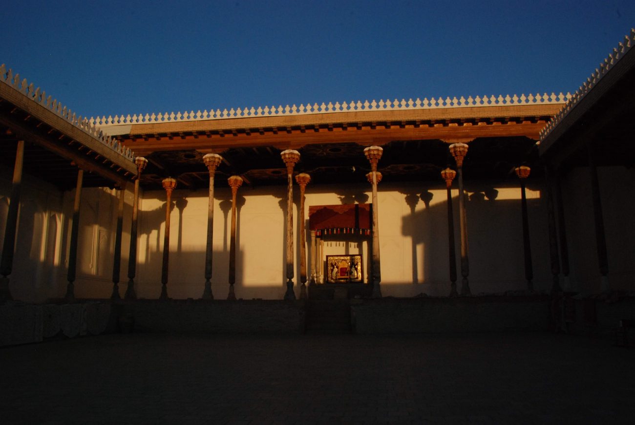 Die Abendsonne lässt den ehemaligen Thronsaal der Festung Ark in Buchara noch einmal im goldenen Glanz leuchten.