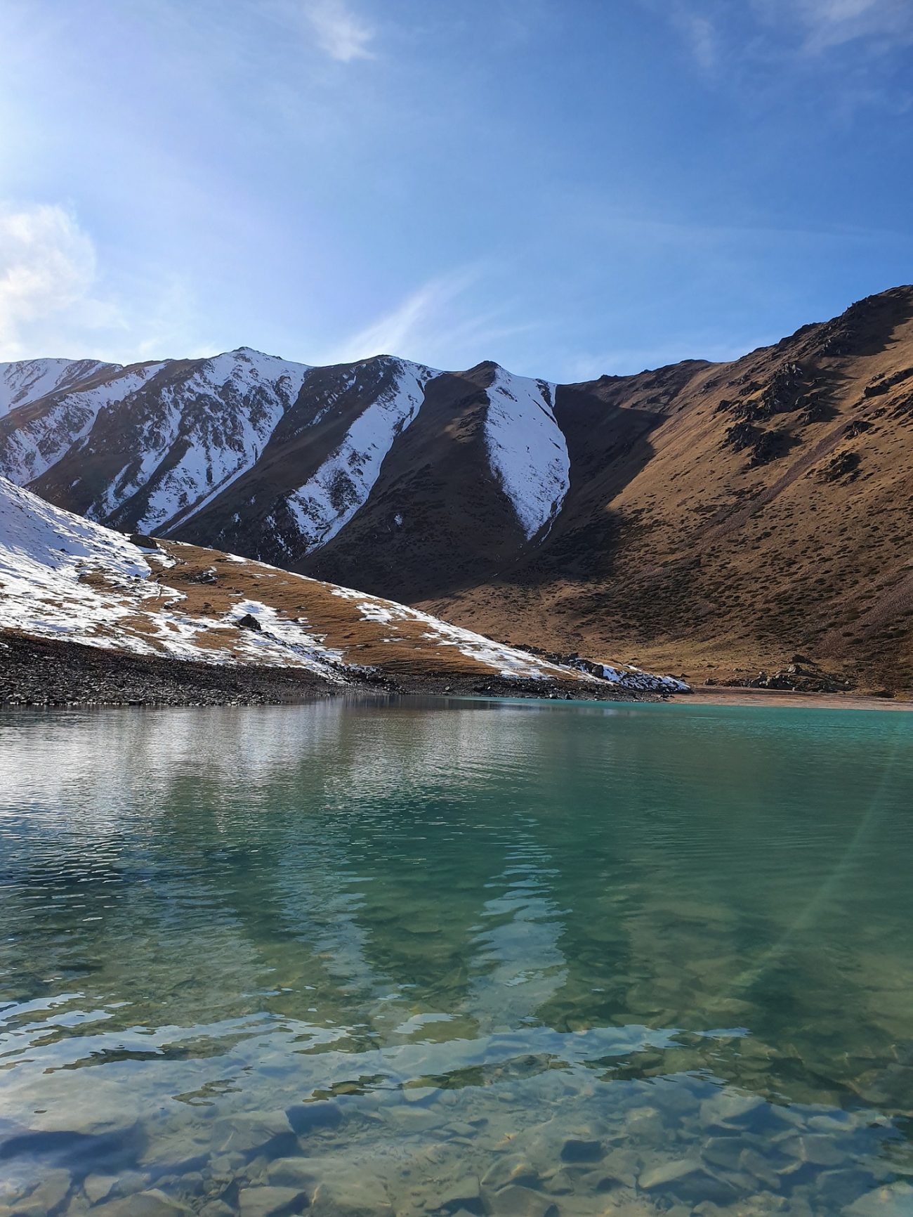 Der Köl-Tor-See in Kirgistan, nicht weit von der Hauptstadt Bischkek enfernt, versteckt sich in einer kargen Berglandschaft.
