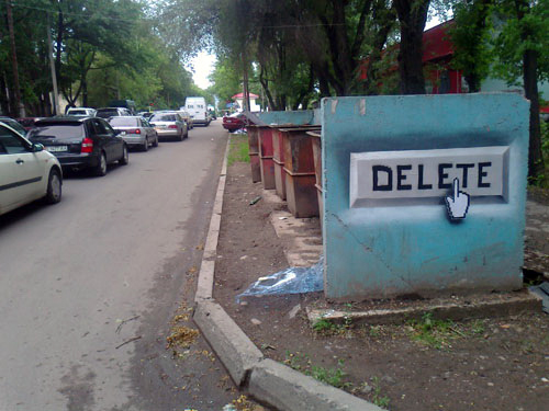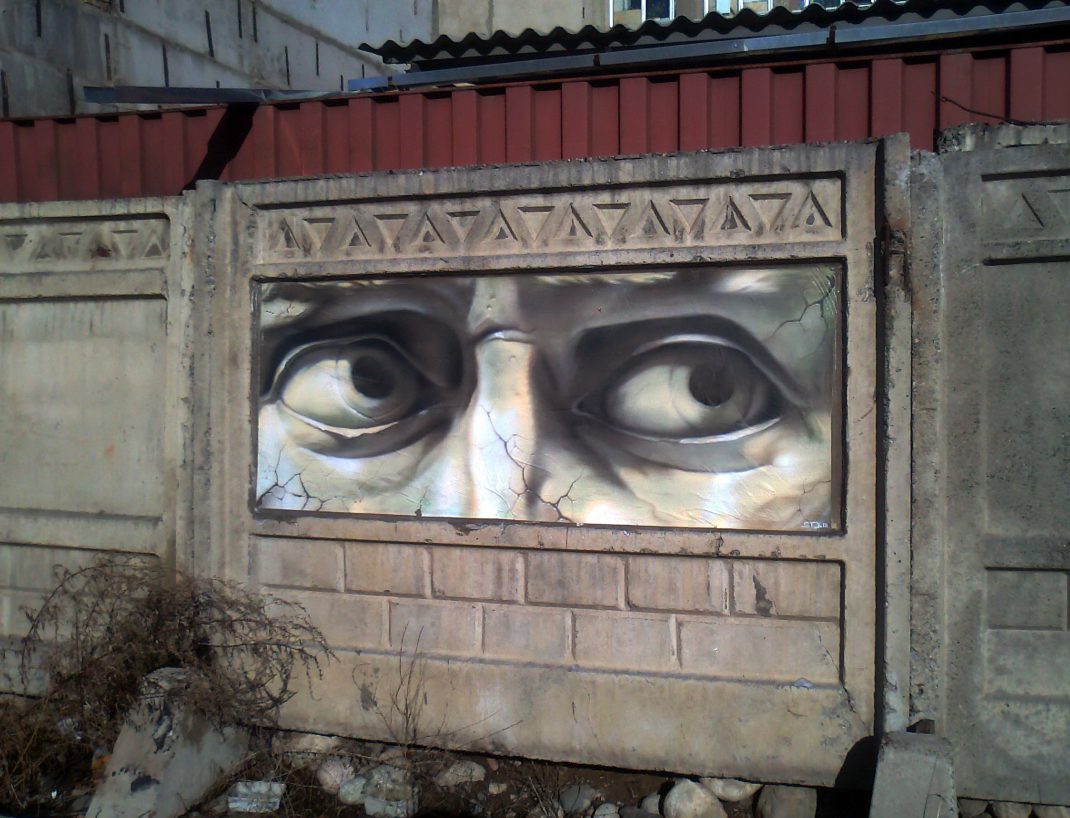 Sergej: Lasst mich mal aus meinem Blickwinkel unsere Geschichte erzählen. Dima und ich arbeiteten vor sechs Jahren in einer Malerwerkstatt. Plötzlich verschwand Dima irgendwohin, wir dachten schon, er wäre in irgendeine Sekte eingetreten: dann kam er auf einmal mit verrückten Ideen zurück, mit seiner modernen Kunst. Und in dieser Situation überzeugte er mich davon, dass das, was wir damals machten, Airbrush, das Streichen von Innenwänden – dass das alles eine Sackgasse ist, die uns nirgendwo hin führt! Dass es besser wäre, sich der modernen Kunst zu widmen. Der erste Banksy-Film hat mich zum Umdenken gebracht: „Exit through the gift shop“ (Banksy ist ein weltberühmter Graffiti-Künstler, Anm. d. Red.). Danach wusste ich, dass ich auf die Straße gehen und dort aktiv werden muss.