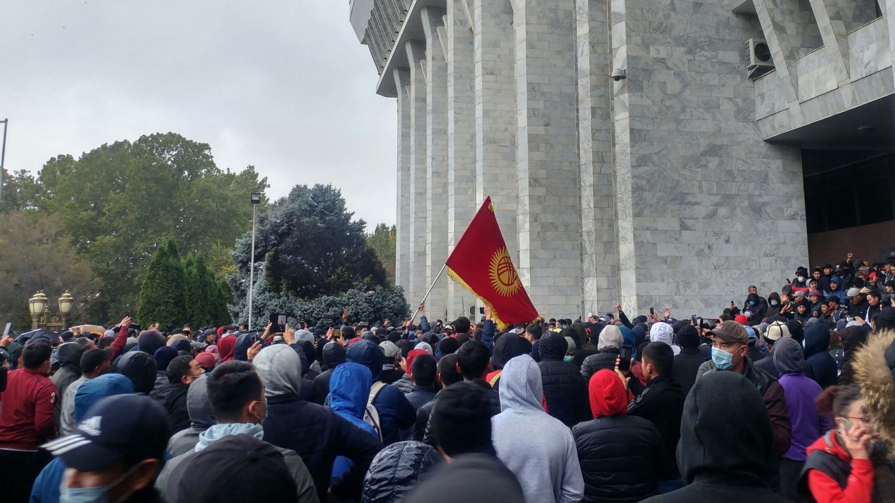 Am Montag riefen mehrere Oppositionsparteien zu einer Demonstration auf. Mehrere Tausend Personen versammelten sich auf dem Ala-Too-Platz im Zentrum der Hauptstadt Bischkek mit der Forderung, die Wahlergebnisse zu annullieren. Am späten Abend eskalierte die Situation schließlich, als Ordnungskräfte versuchten die Demonstration aufzulösen. Es gab vereinzelt Straßenkämpfe. In der Nacht auf Dienstag gelangten Protestierende in das „Weiße Haus“, den Sitz von Parlament und Präsidentenverwaltung. Sie stießen dabei auf keinerlei Widerstand. Auch danach war von Ordnungskräften erst einmal kaum eine Spur.