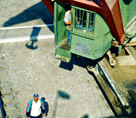 Ein Eisenbahnkran, der im Rahmen von Gleisbauarbeiten eingesetzt war, gesehen von einer Fußgängerbrücke… [...]