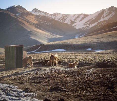 Kühe erwachen am frühen Morgen gegenüber dem Karawanserei von Tasch-Rabat, ehemals eine Etappe der Seidenstraßen. Auf der Ebene zwischen diesen Bergen warten die seltenen Einwohner auf den Winter… [...]