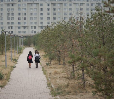 Anwohnerinnen auf dem Weg zu ihren Wohnungen in einer großen Wohnanlage…
