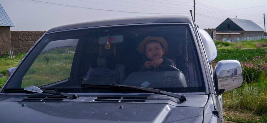 In Kyrgyzstan, a child from the village of Sary-Mogul plays in his grandfather’s car.