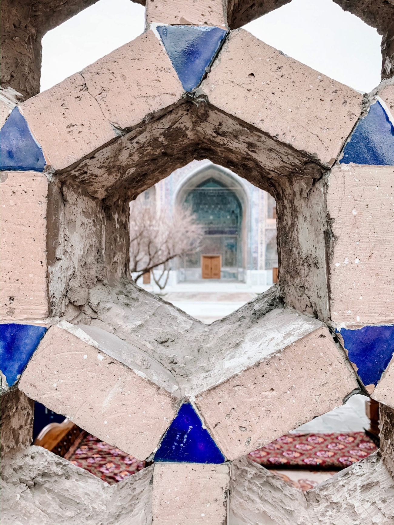 The inner courtyard of the Sher-Dor Madrasa at the Registan in Samarkand loses none of its beauty even at cold temperatures.