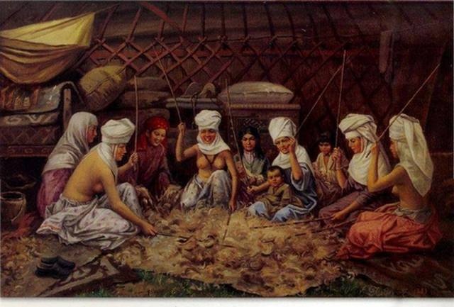 Dans le tableau de Khloudov, on trouve une image du quotidien : des femmes kazakhes en habit traditionnel battent une peau de mouton avec des bâtons pour préparer du feutre. Certaines de ces femmes le font la poitrine nue.
