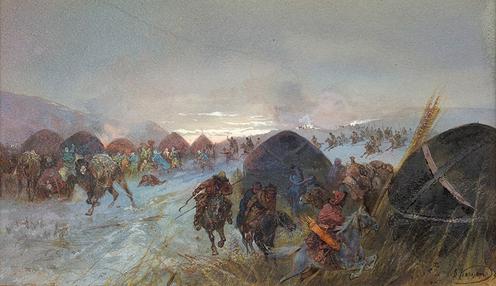 L’armée du khan s’est frayé un chemin à travers les terres kirghizes en massacrant la population et en détruisant des villages entiers. Nikolaï Sereda décrit comment les soldats de Kenesary ont jeté des habitants dans des chaudrons d’eau bouillante, ce qui peut être vrai, mais cela peut être aussi attribué à la « propagande ennemie ». Quoi qu’il en soit, la guerre menée par le khan fut effectivement très cruelle – la plupart des sources s’accordent sur ce point.