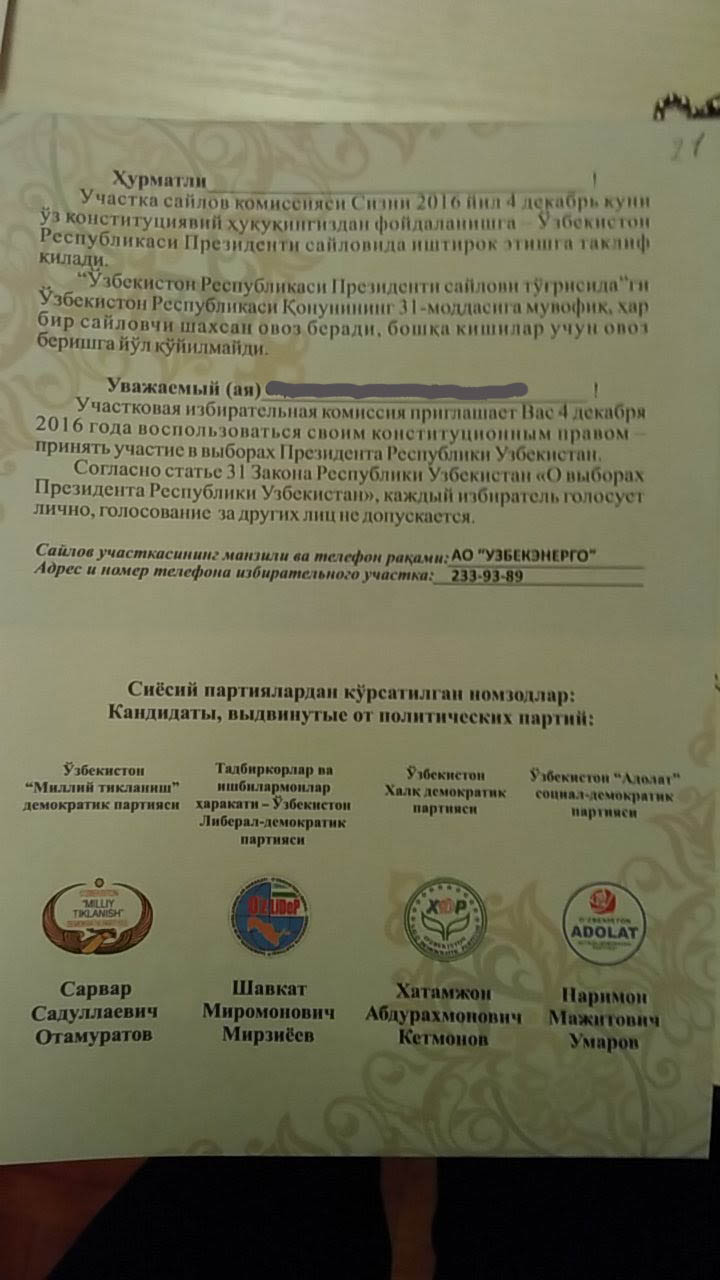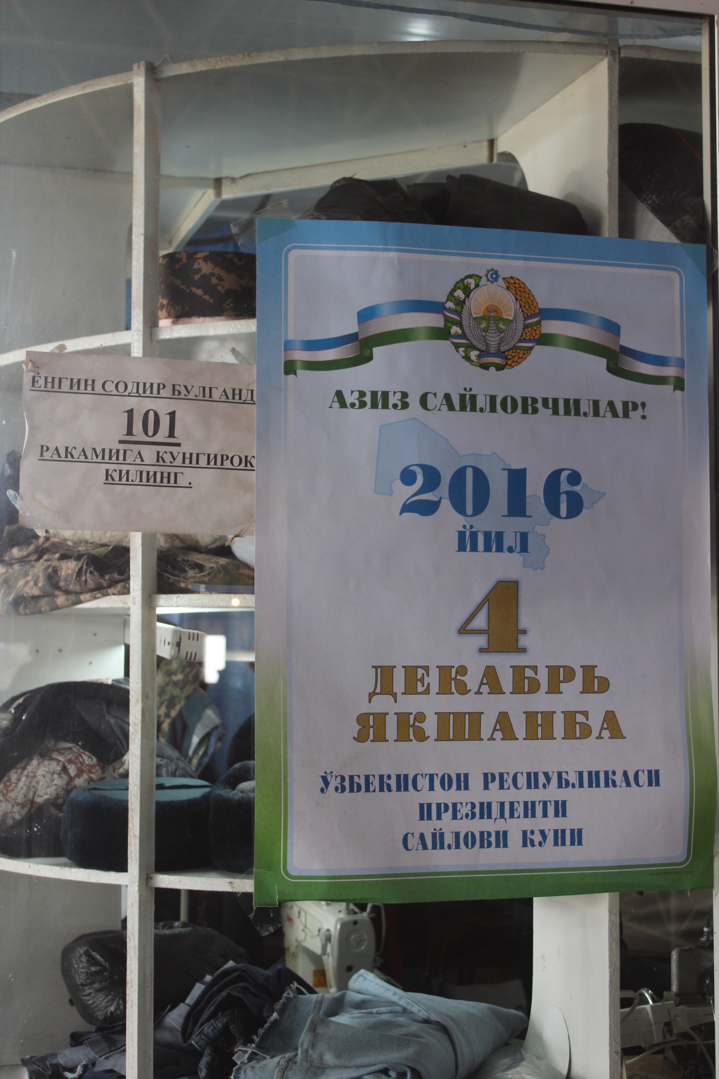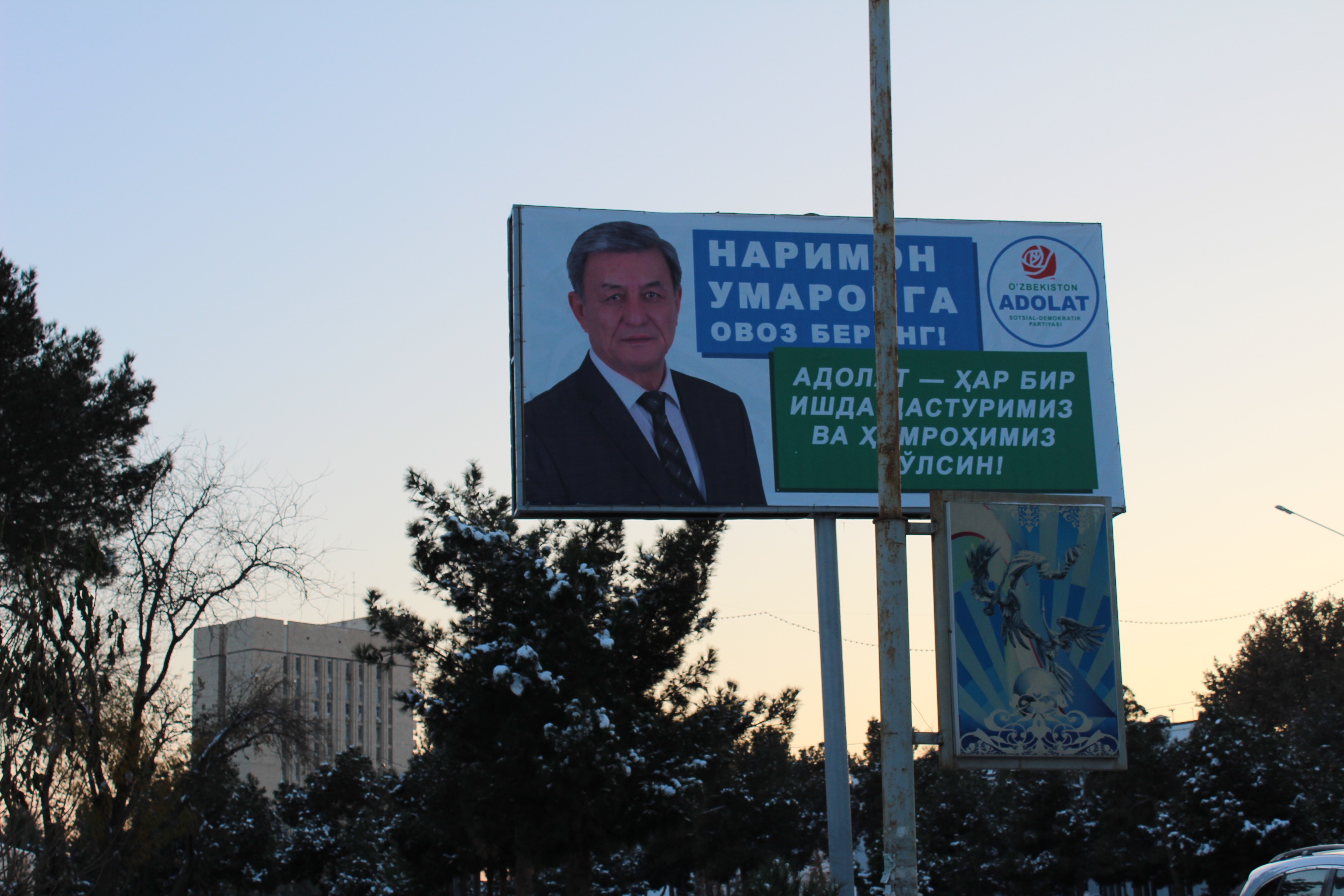 Début novembre, les affiches des quatre candidats (Chavkat Mirzioïev, Sarvar Otamouratov, Narimon Oumarov et Khatamjon Ketmonov) ont été placardées dans la capitale ouzbèke.