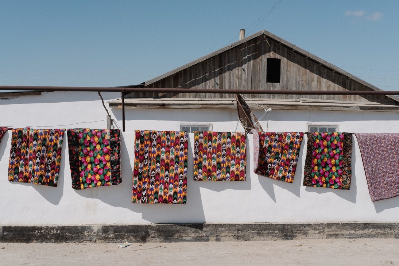 Les kourpachas, tapis traditionnels ouzbeks, qui ornent les demeurent de tous les ménages, sèchent au soleil à Moynaq, au Karakalpakistan, dans l’ouest de l’Ouzbékistan.