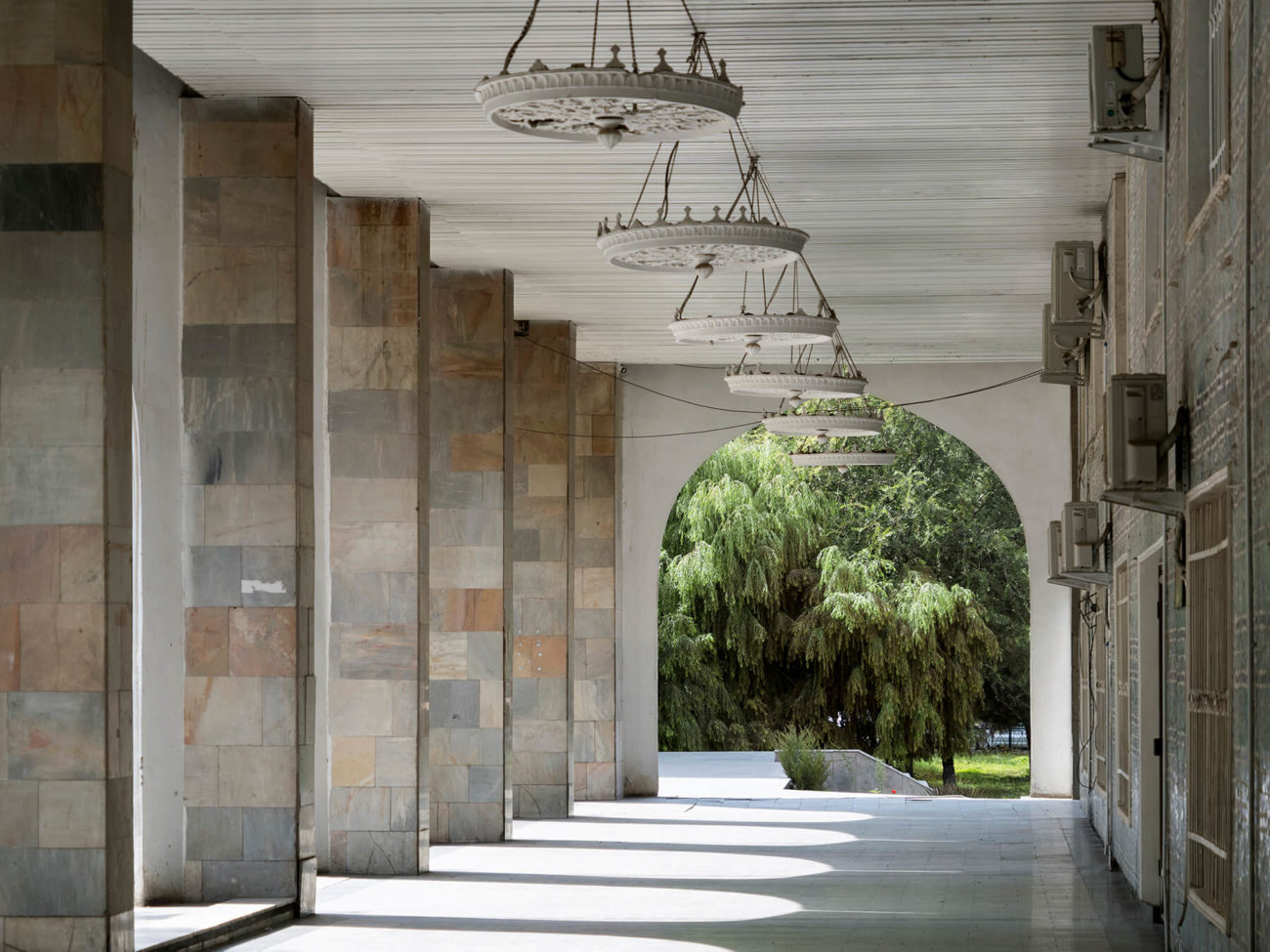 La colonnade autour du hall d’exposition de l’Académie des Arts de Tachkent, en Ouzbékistan, mène directement à la campagne : le parc qui entoure le bâtiment invite les visiteurs à se promener après avoir visité l’exposition.