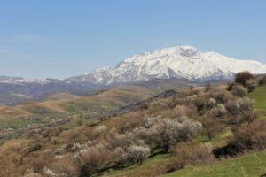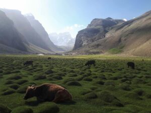 Au dessus du lac de Kaïrakoum, dans le nord du Tadjikistan, le soleil du soir baigne le ciel et le lac dans une lumière dorée. En été, ce moment de la journée est très apprécié pour les promenades. Après le coucher de soleil, les températures fraiches permettent à nouveau de se trouver à l’extérieur.