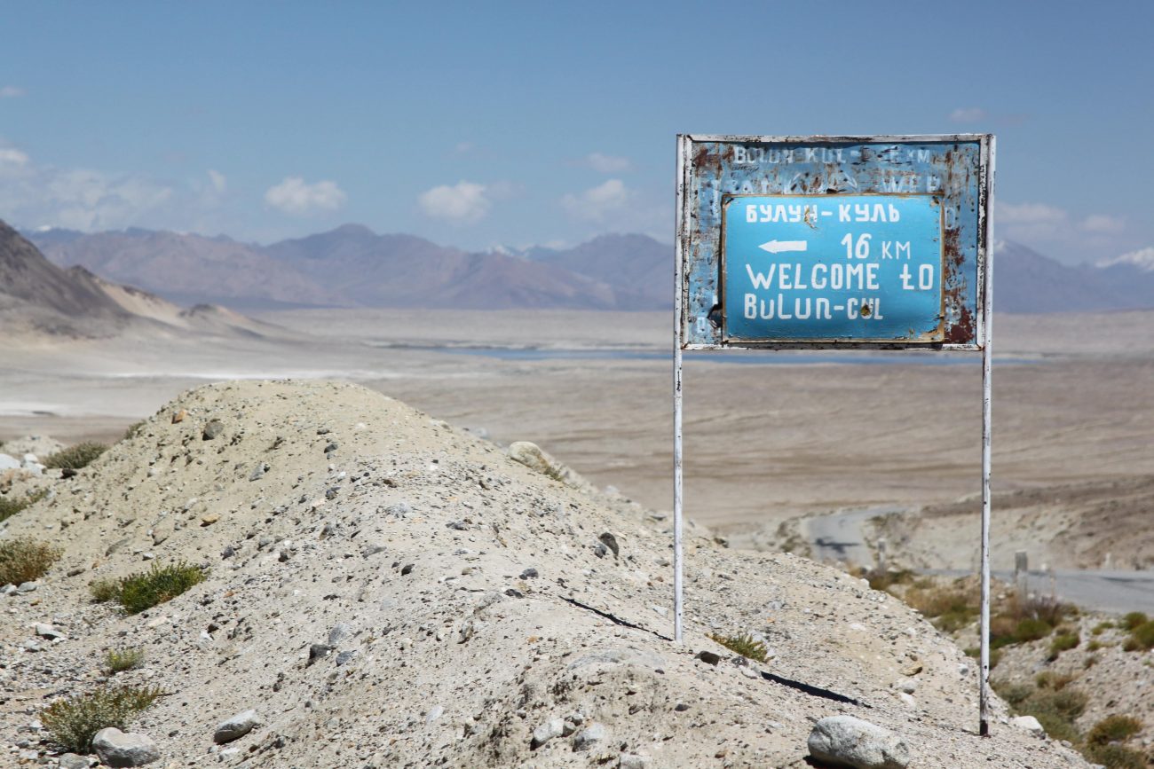 Un panneau indique le chemin du lac Boulounkoul dans les montagnes du Pamir, dans l’est du Tadjikistan. Le lac d’un bleu profond se trouve à une altitude de 3600 mètres.