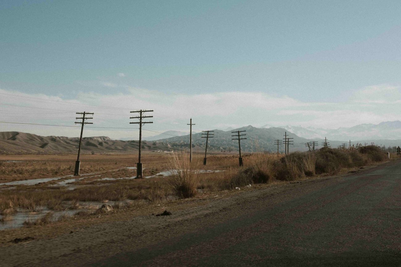 La route reliant par la côté sud les villes d’Issyk-Koul et de Karakol est enclavée entre le lac et la chaîne de montagnes du Tien Shan.