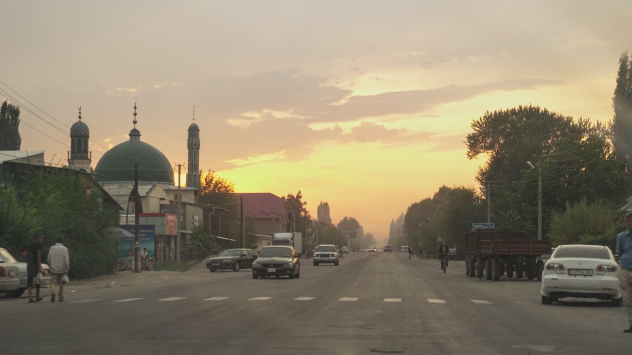 Le coucher du soleil plonge les routes poussiéreuses de Bichkek, au Kirghizstan, dans une chaude couleur orange.
