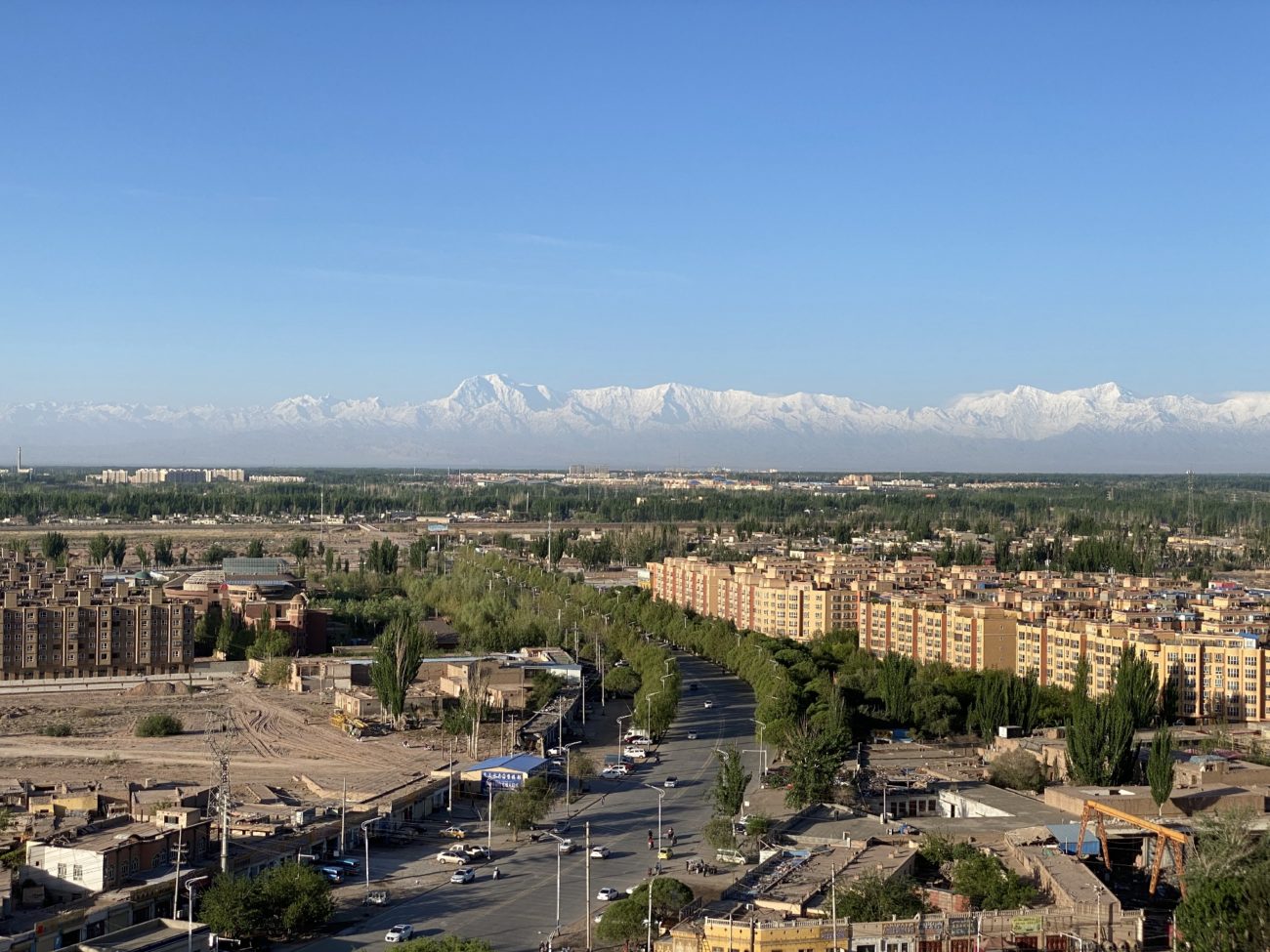 Vue sur la chaîne de montagnes Kounloun, à l’endroit où elles croisent les monts du Pamir, depuis la ville de Kachgar, dans la région ouïghoure de l’ouest de la Chine, appelée administrativement Xinjiang. Les monts Kounloun bordent le désert du Taklamakan sur plus de 3 000 kilomètres, formant le bord nord du plateau tibétain.Crédit: La Rédaction