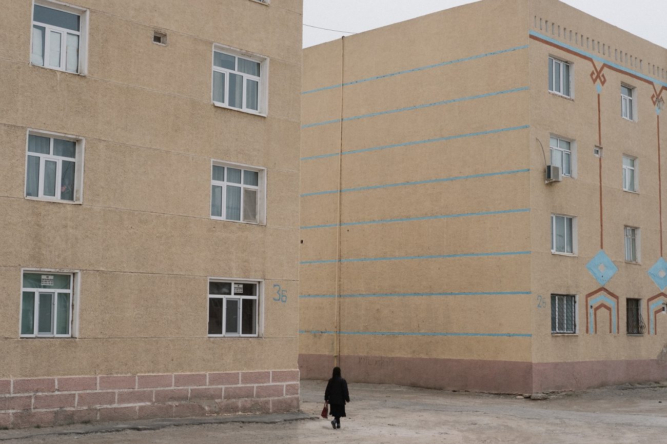 Une femme rentre chez elle à Noukous, en Ouzbékistan.