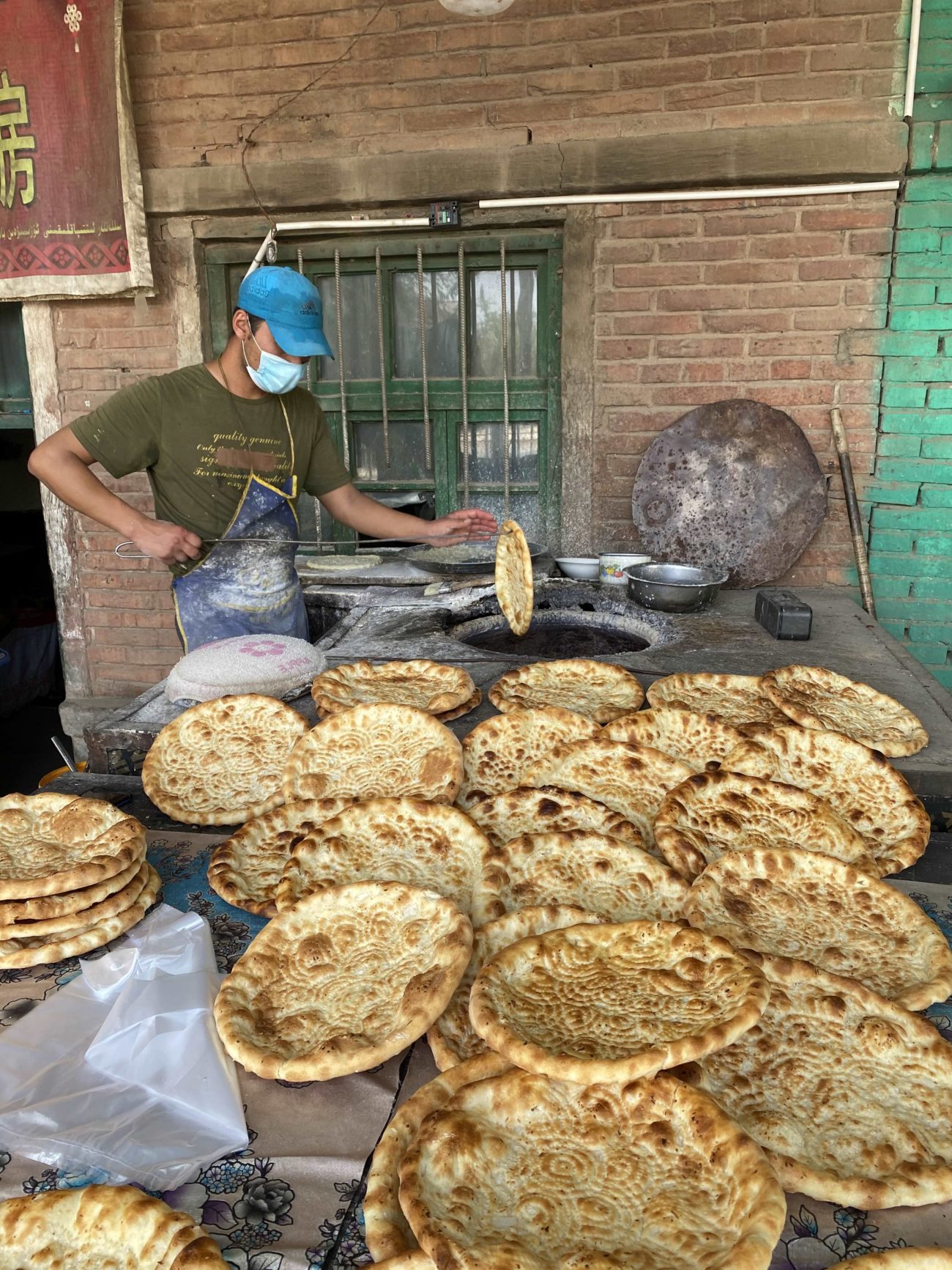 Un boulanger sort du four un pain traditionnel Naan près de la ville de Tourfan, au centre de la région ouïgoure de l’ouest de la Chine. Crédit : La Rédaction