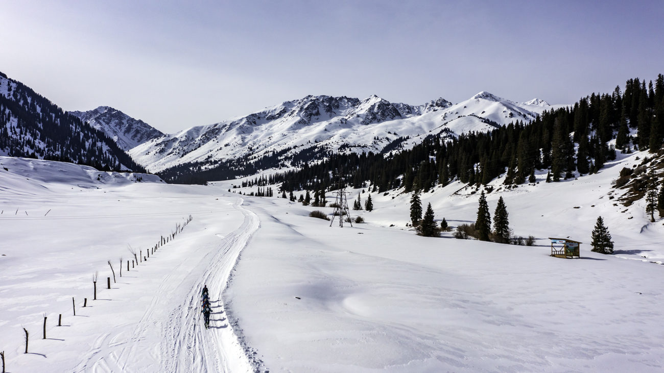 A Jyrgalan au Kirghizstan, un groupe de skieurs débute une randonnée qui leur prendra une petite demi-journée et qui leur permettra une belle descente dans une belle neige poudreuse.