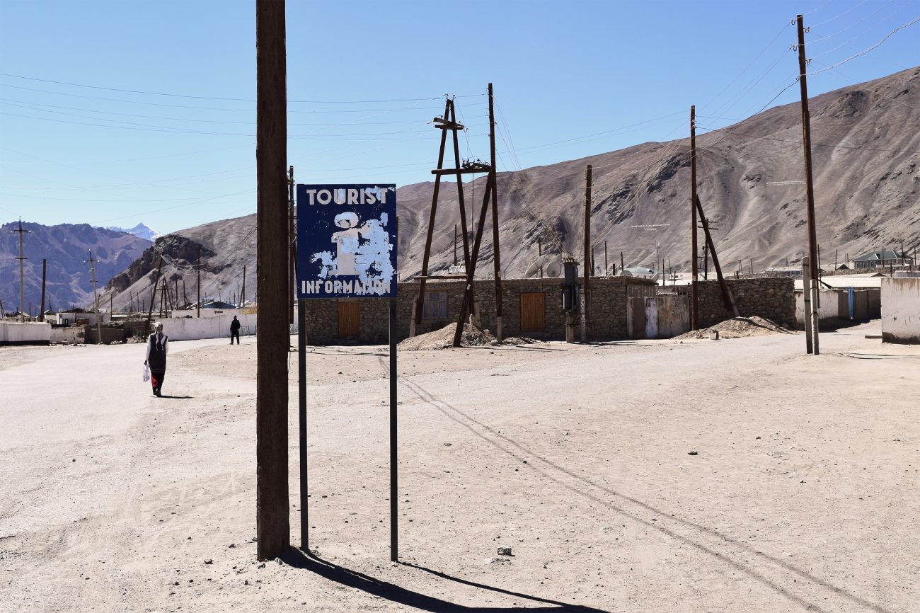 Mourgab est la capitale régionale du Pamir oriental (Tadjikistan) avec ses 5 000 habitants. Il y avait visiblement une information touristique par le passé, dont il ne reste que le panneau aujourd’hui.