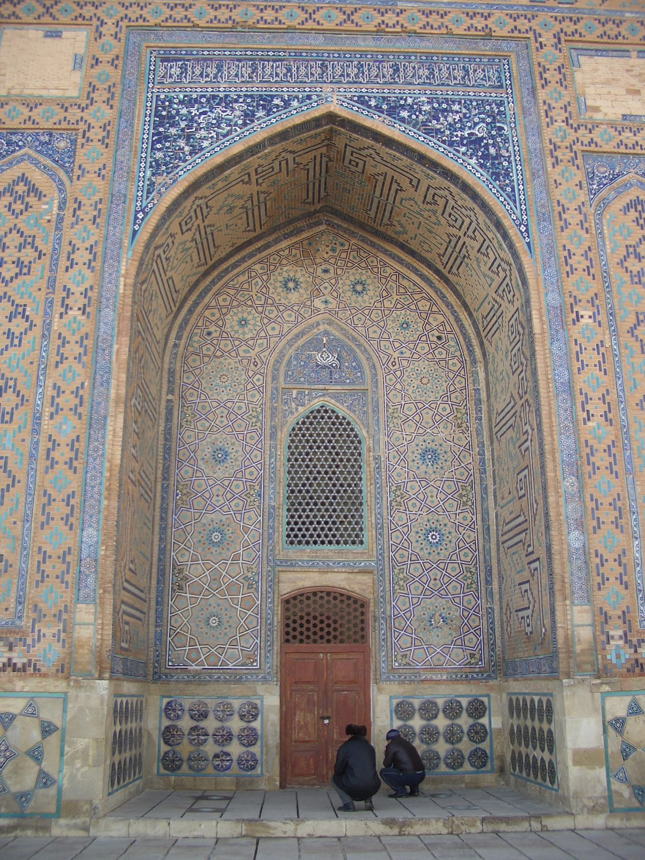 Deux hommes à l’entrée du Mausolée de Yasavi au Turkestan, Kazakhstan.