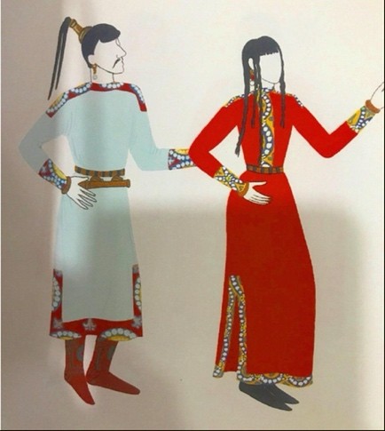 Avant cette période, la mode était complètement différente. Au Vème et VIème siècle, les Sogdiennes portaient des robes ajustées à la taille haute, à volants décorés, des perles et des rayures. En hiver, les robes s’accompagnaient de capes et de bottines noires ajustées, tandis qu’en été, elles étaient portées avec des sandales décorées de perles et de boucles ornées de rubans.