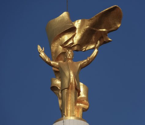 Statue en plaqué or de l’ancien président Saparmourat Niazov, tournée en direction du soleil et placée au sommet de l’Arche de la neutralité à Achgabat. Crédit: Konstantin Novaković (Serbie)… [...]