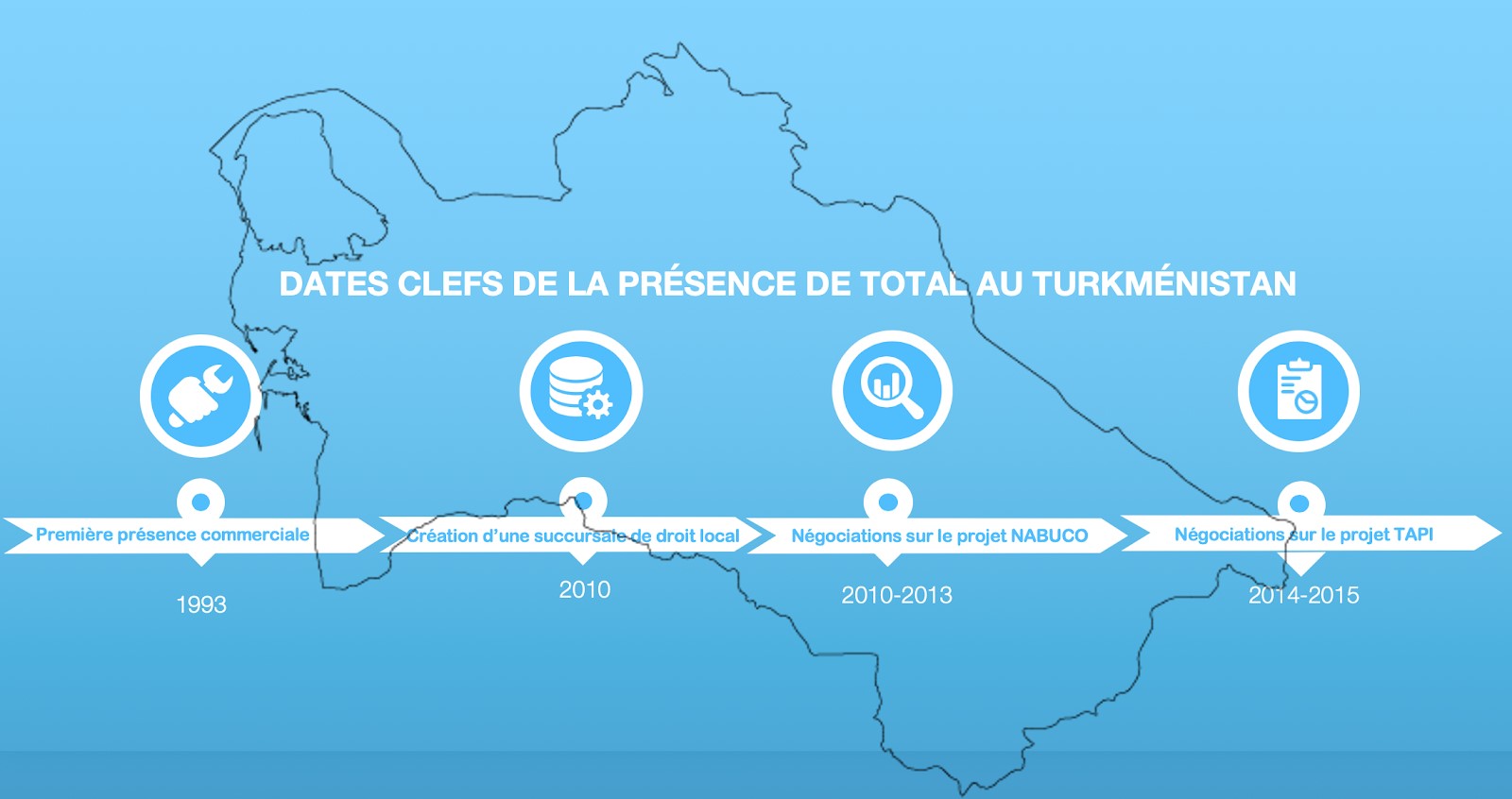 Total et le Turkménistan, c’est une relation qui dure. Depuis son arrivée en 1993, Total a établi l’un de ses ancrages les plus durables en Asie centrale, juste après le Kazakhstan. Entre temps, si la plus grande entreprise française a progressivement et ouvertement développé ses activités dans les pays voisins, au Turkménistan tout reste secret ou très peu visible, à l'image du pays. Quelques communiqués mentionnent le Turkménistan, sans refléter son importance potentiellement stratégique pour l’entreprise française.
