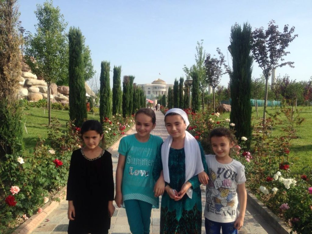 Schinosa (in der Mitte, mit Kopftuch) und ihre Freunde, alle zwischen 8 und 11 Jahren alt, haben ihren Sonntag im Rudakipark in Duschanbe genossen. Sie glauben, dass Tadschikistans erster und noch immer amtierender Präsident Emamoli Rahmon, dessen Palast man im Hintergrund sehen kann, ein großartiger Führer ist, da sie viele tolle Sachen über ihn in der Schule gelernt haben.