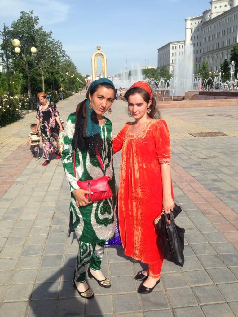Schakhe und Maduba tragen beide farbenfrohe tadschikische Kleider auf ihrem Stadtbummel im Zentrum Duschanbes. Im Gegensatz zu den meisten anderen zentralasiatischen Staaten der ehemaligen UdSSR, die größtenteils von türkischen und nomadischen Traditionen beeinflusst sind, sind Tadschikistans Sprache, Kultur und ethnische Zusammensetzung dem Iran näher.