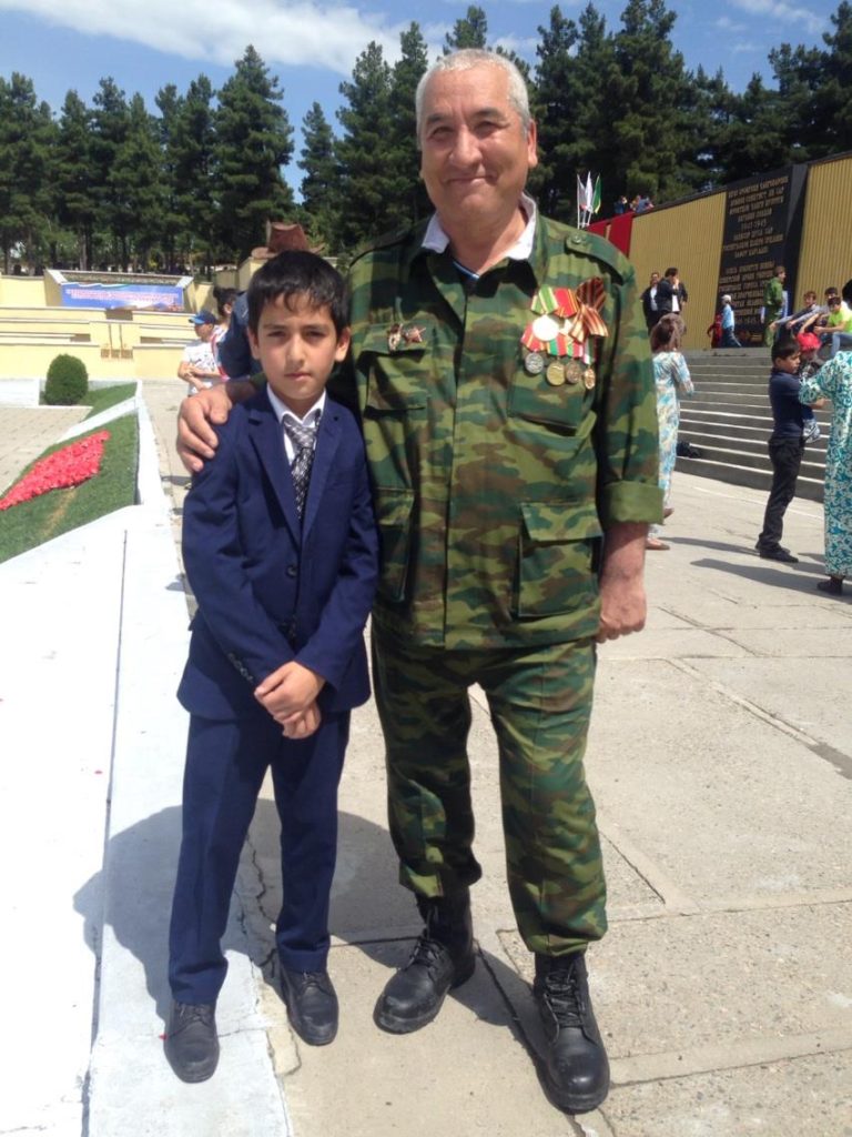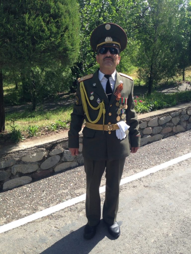 Das ist Polkownik (Oberst) Ismailow. Er ist Leiter der Militärabteilung der Medizinischen Universität von Duschanbe und Veteran des Sowjetkrieges in Afghanistan. Er erschien in seiner vollen tadschikischen Armeeuniform für die Feierlichkeiten zum Tag des Sieges, der den 71. Geburtstag der Verteidigung der UdSSR gegen Nazideutschland im Zweiten Weltkrieg markiert. Er gedenkt so auch seinem Vater, der im Zweiten Weltkriegim südlichen Sektor der Front kämpfte, zum Beispiel im Kampf um Kursk.