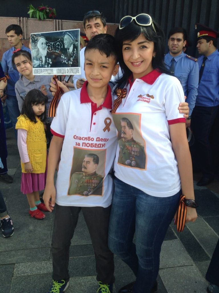 Schenya und ihr Sohn nahmen beide am „Unsterblichkeitsmarsch“ in Duschanbe, teil, bei dem sieverstorbenen Familienmitgliedern gedachten, die im Krieg kämpften. Stolz zeigt sie ein Foto ihres Urgroßvaters, Nuriddin Achmedow, der im Kampf um Berlin kämpfte und angeblich einen wichtigen Posten in der sowjetischen Nachkriegsadministration der Stadt innehatte, und an ihren Großonkel, Fachriddin Achmedow, der ein Mitglied des NKWD, Stalins berüchtigter Geheimpolizei, war. Trotz der Tatsache, dass Stalin den Großteil der tadschikischen Intelligenz in den 1930ern ausrottete, ist sie ganz vernarrt in ihn, der „hart, aber gerecht“ war und glaubt, dass die heutigen „schwachen Politiker“ die ein oder andere Sache von ihm lernen könnten.