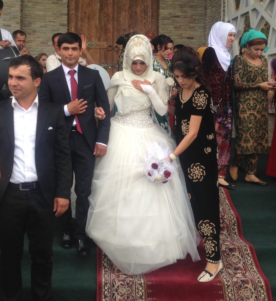 Das sind Nikirus (24) und Takhmina (19) bei ihrer Hochzeit im Dorf Surchochaschma im Westen Tadschikistans. Tadschikische Hochzeiten sind komplizierte Verfahren, die insgesamt 7 Tage andauern. Dies ist Tag 6 des Marathons, der die Hauptfeier mit der Familie und dem ganzen Dorf darstellt. Während dieses Tages, wurde mir gesagt, ist es der Braut nicht gestattet, zu essen, zu lachen oder zu lächeln und sie ist von einem dichten Schleier verhüllt, den sie nach dem finalen Tag ablegen darf.
